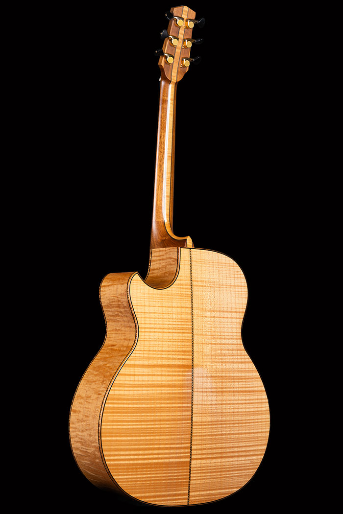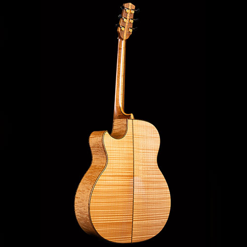 The back and sides are "Curly" Maple, with a matching centre section running the full length of the neck, between two sections of English Walnut.