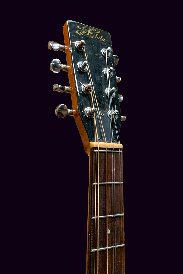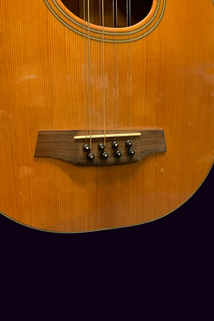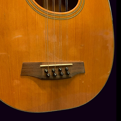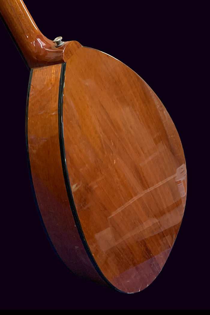 There are a number of small marks in the Cedar soundboard, a buckle scar in the back and one fine crack in the lacquer which we have fixed and reinforced just in case.