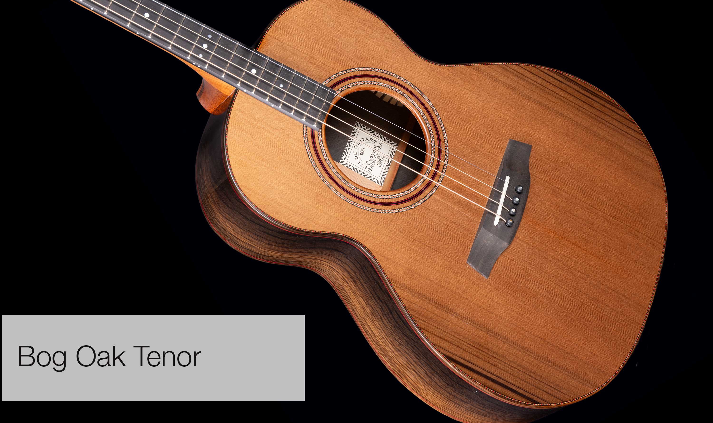 The tenor guitar lends itself to different timbers because of its small size, which means we have more timber to select from. This time its exceptional Bog Oak , the best of English Timbers. The soundboard is Chocolate Cedar, and the body is bound with Bog Oak from the same tree, and red borders.