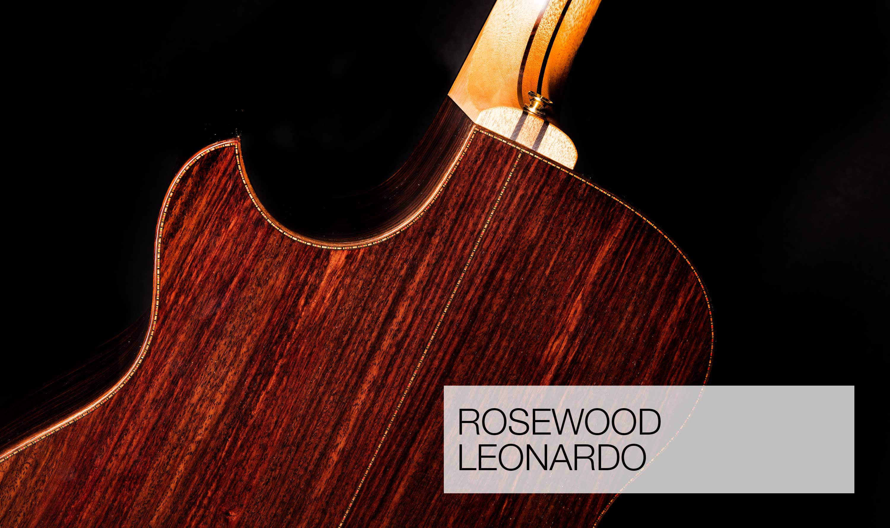 Leonardo with Indian Rosewood body and Sinker Redwood top. Rosewood bindings, neck laminated with mahogany and two lines of Rosewood.
