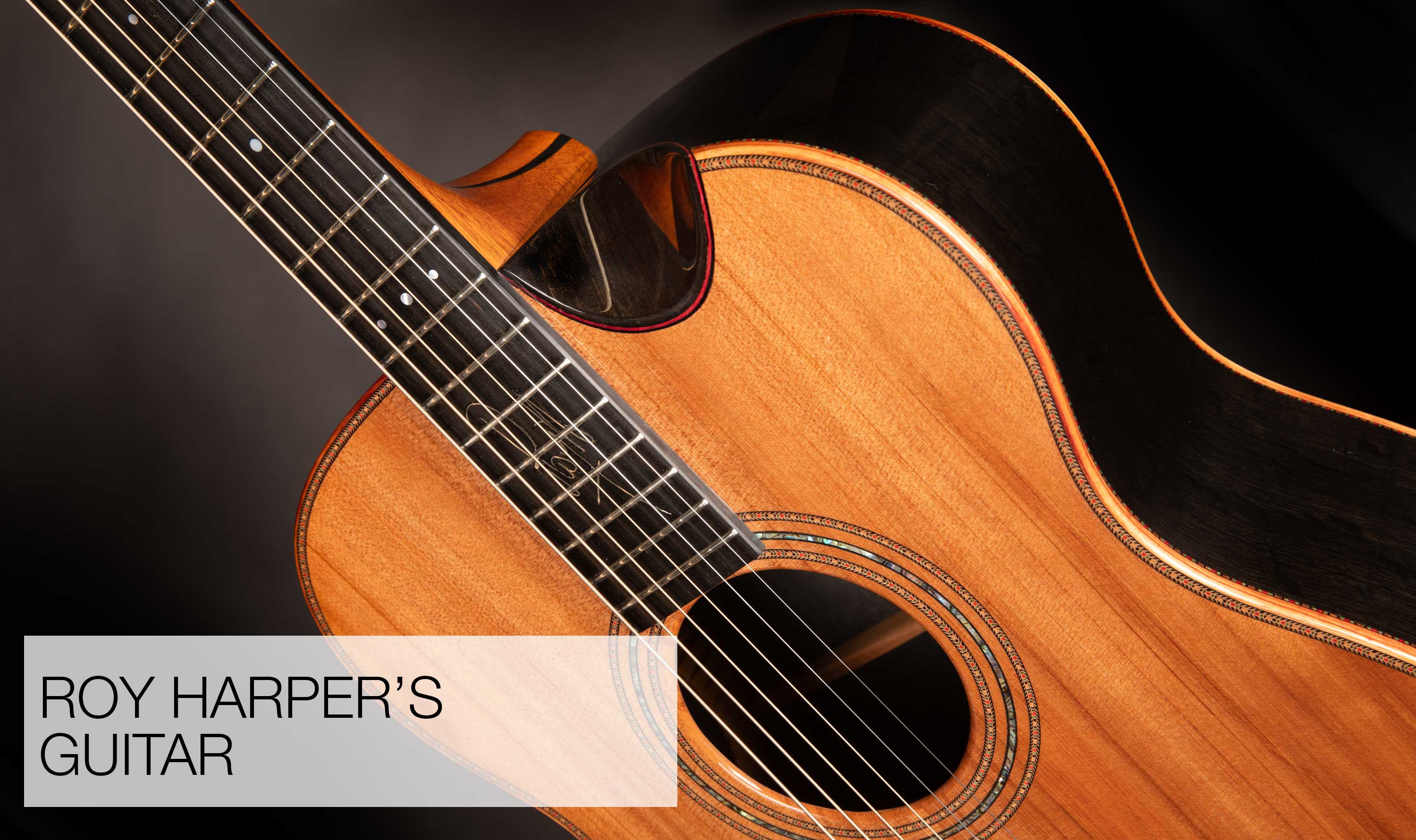 Roy had a Falstaff for many years, so we used that as a basis for lots and lots of discussion. There are differences - a 12 fret neck join, Bog Oak back and sides, a Sinker Redwood soundboard and Tulipwood bindings. The headstock shape and tuner positions are slightly reworked so that Roy can play chords from "above" the nut.