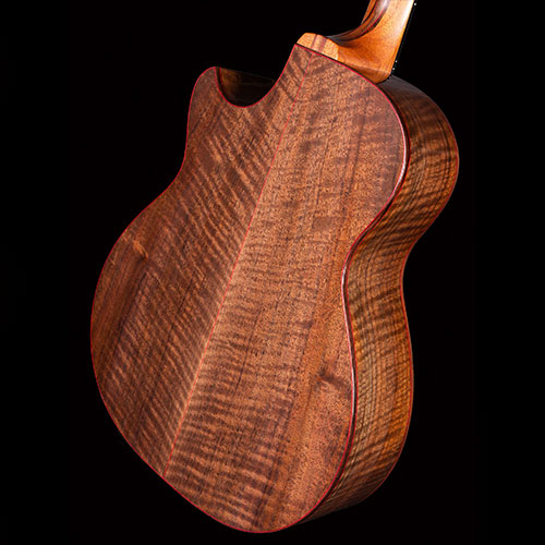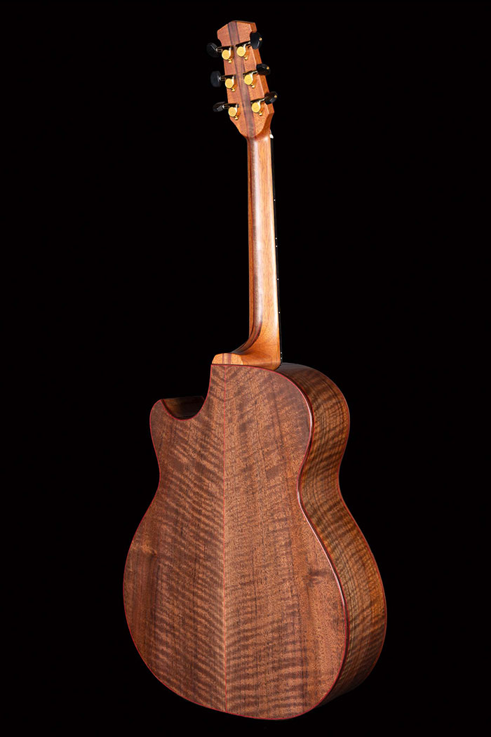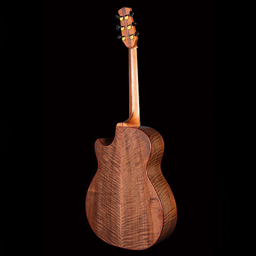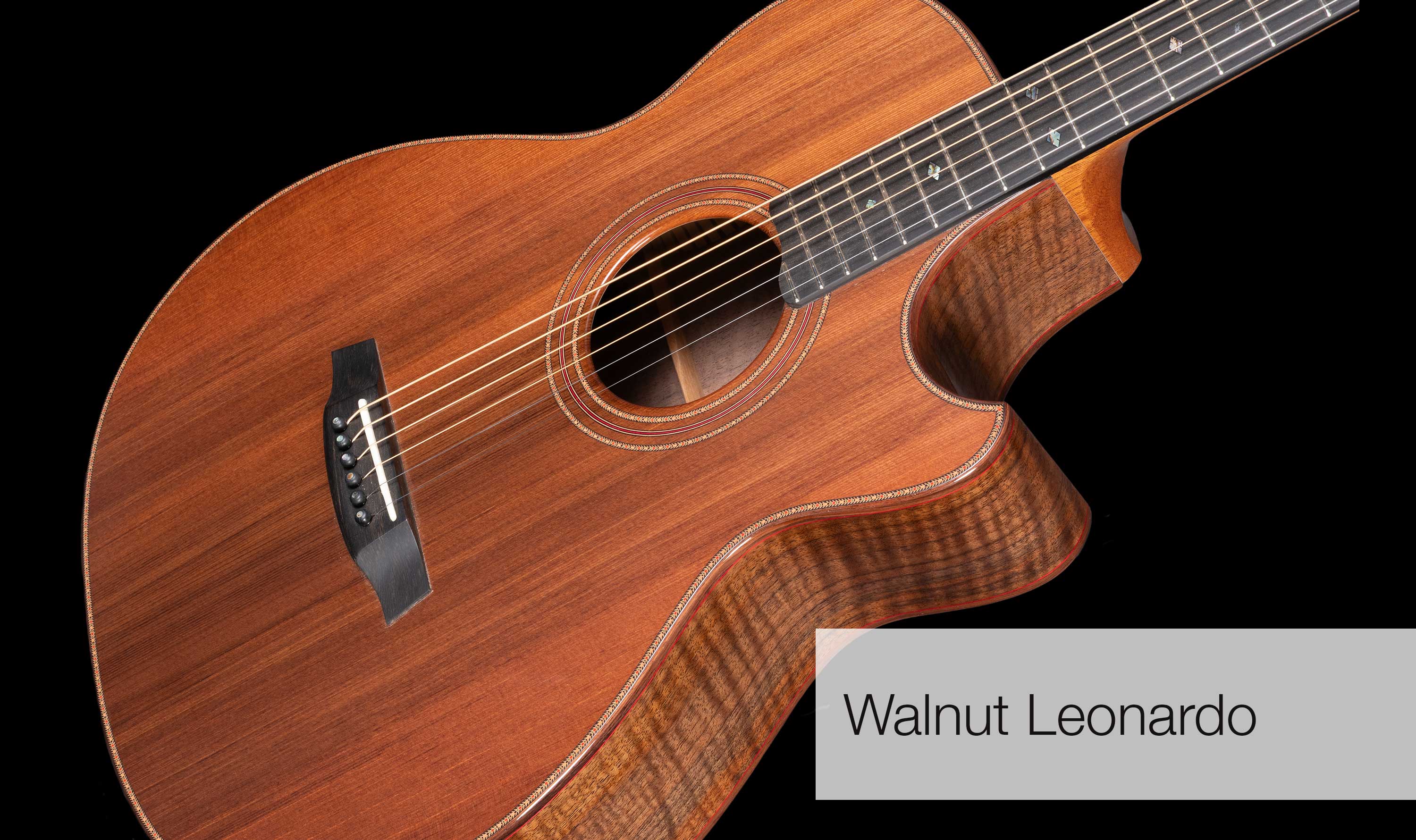 For this guitar I chose the best pieces of figured Claro Walnut to pair with the fine dark Sinker Redwood soundboard. The neck is made from Walnut and Mahogany, all possible only because we have such "extensive" timber stocks. Gotoh tuners, 45mm neck with Abalone Diamond inlays.