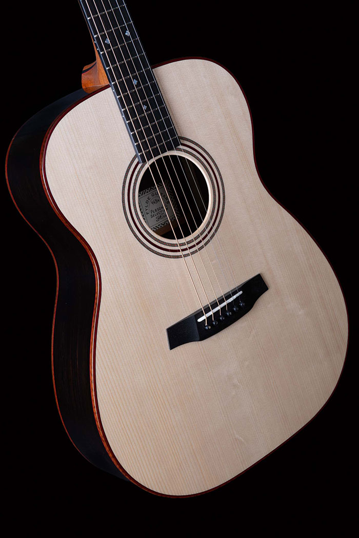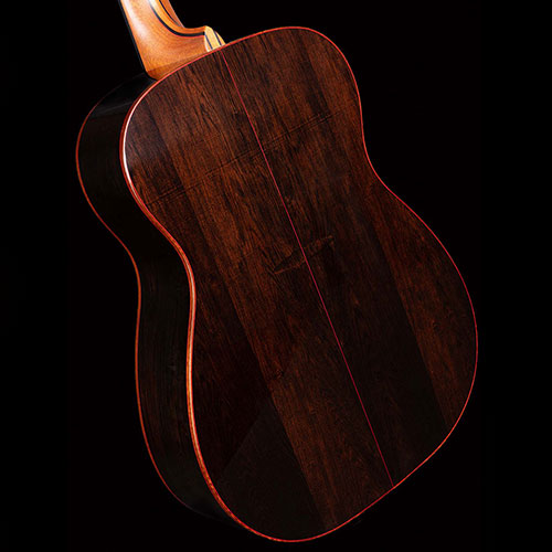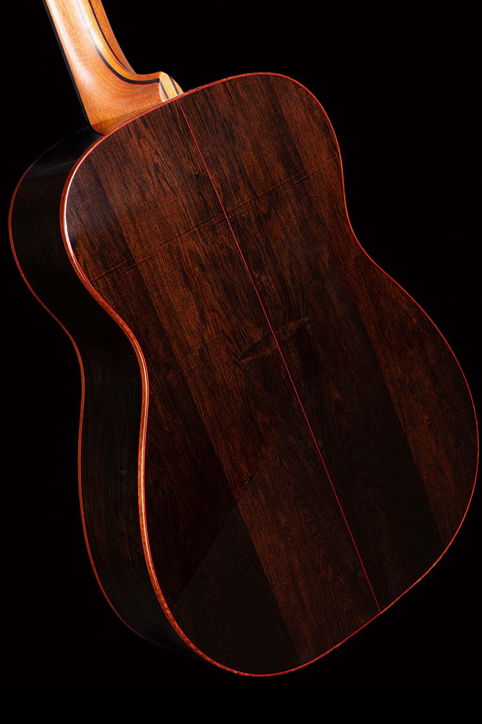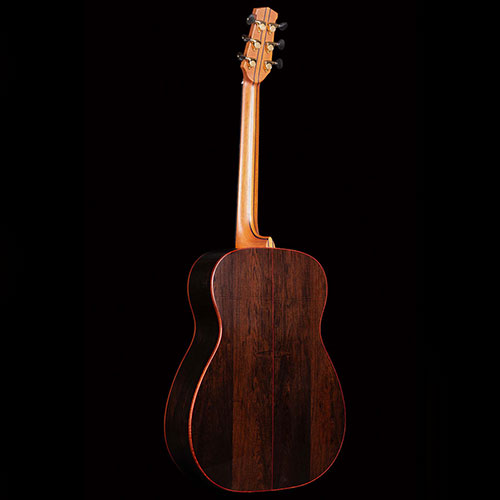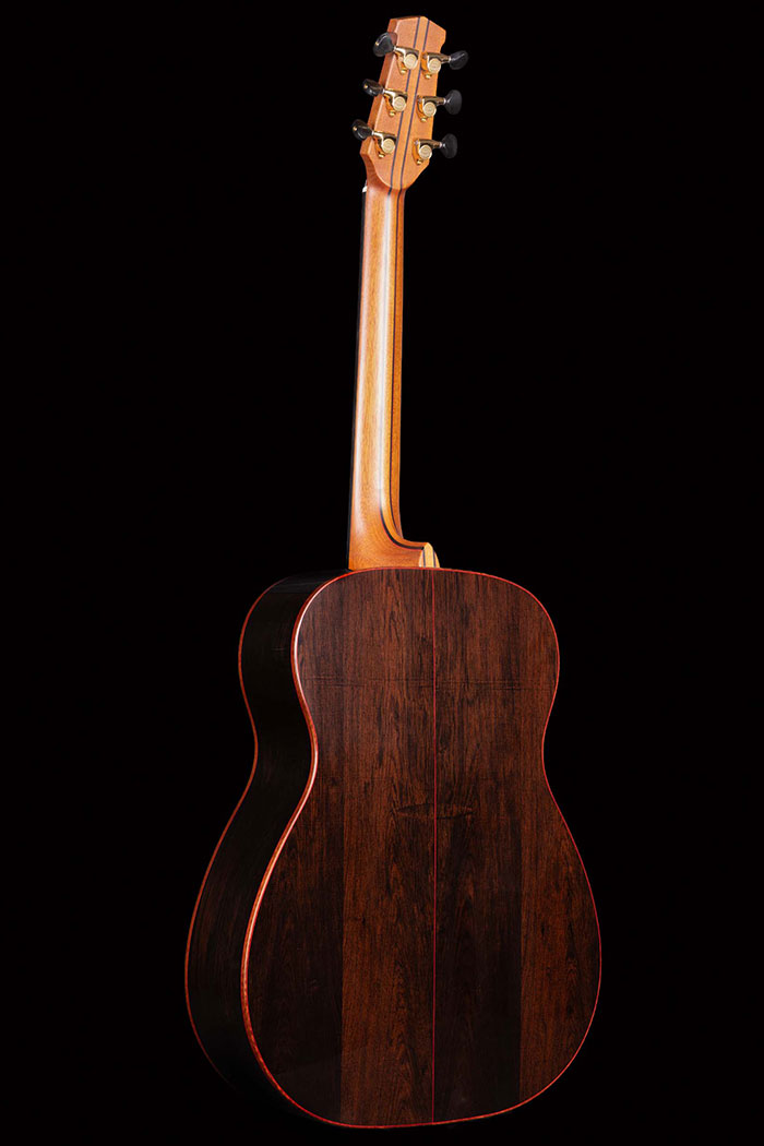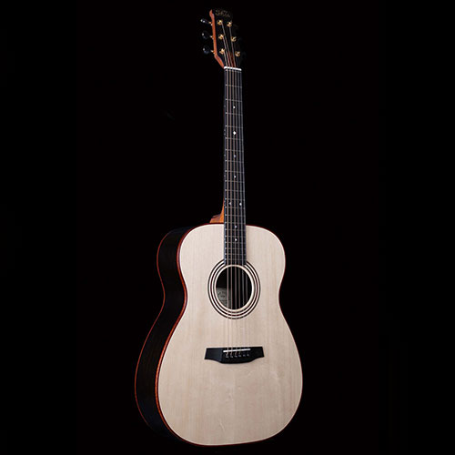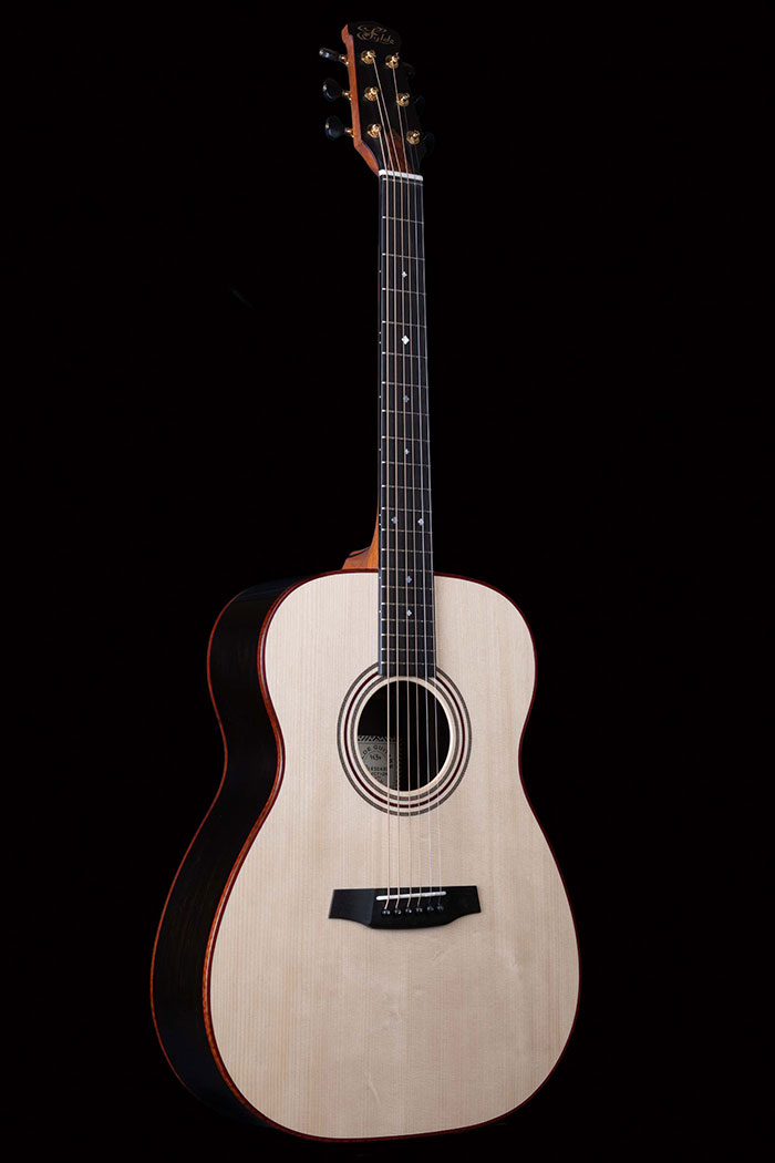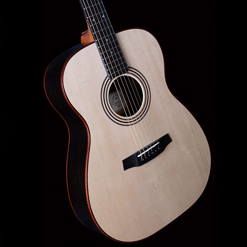 Falstaff size, very slightly shallower body. African Blackwood back and sides. Adirondack Spruce soundboard.