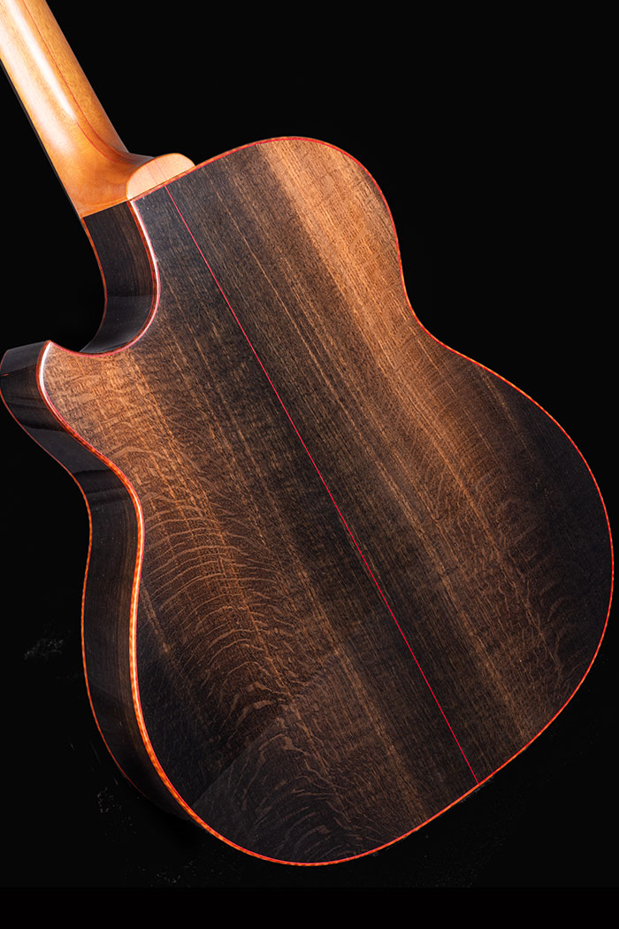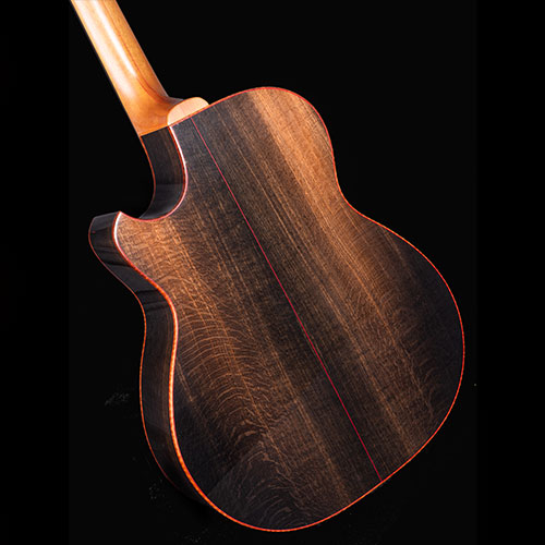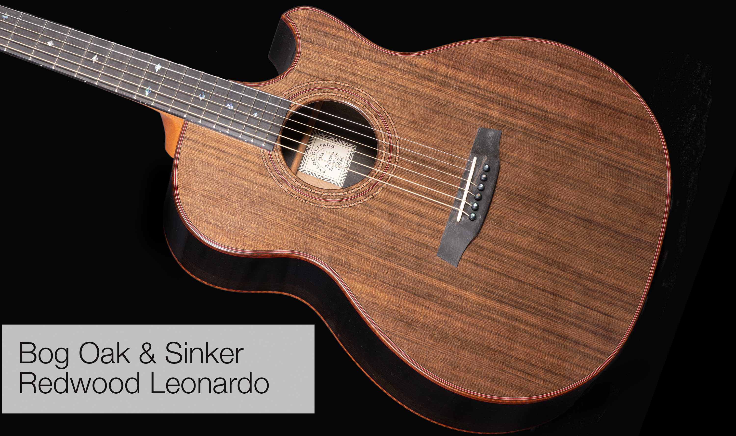 Gorgeous shaded quarter sawn Bog Oak, over 3,000 years old from East Anglia, combined with Old Growth Sequoia “Sinker” Redwood, pulled from the depths of Big River in Mendocino, California. Snakewood bindings from Surinam with fine red borders, neck laminated from exceptional Brazilian Mahogany.