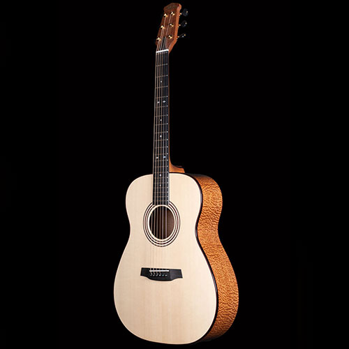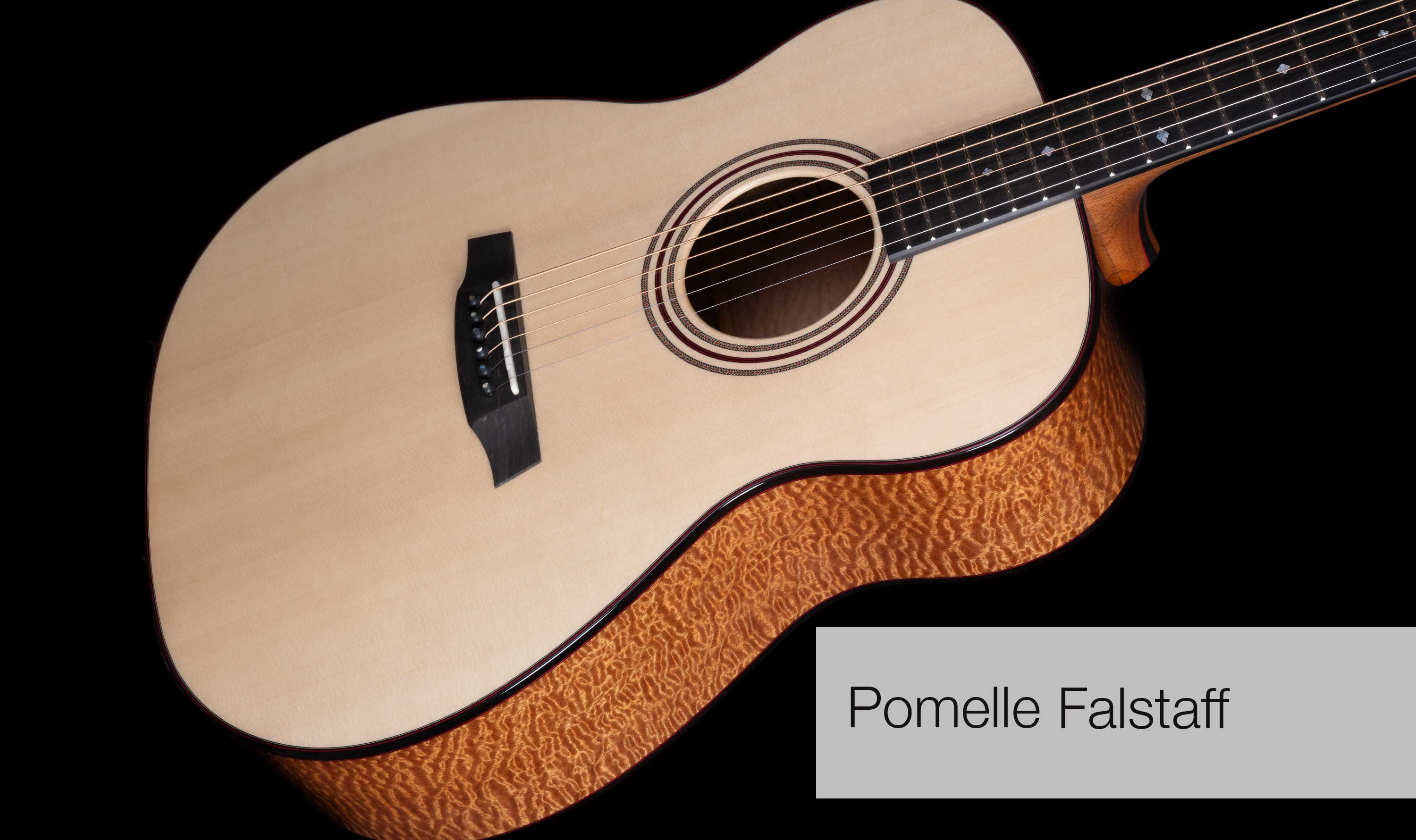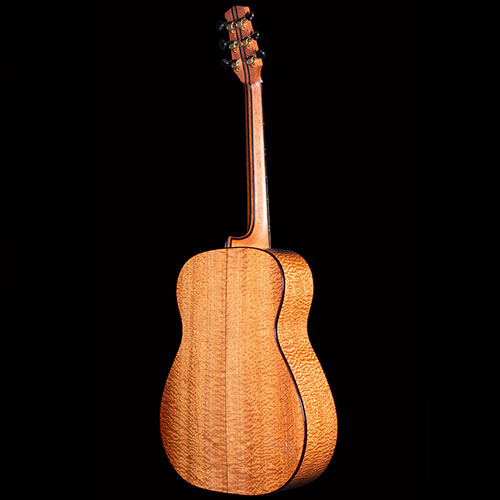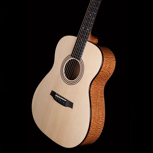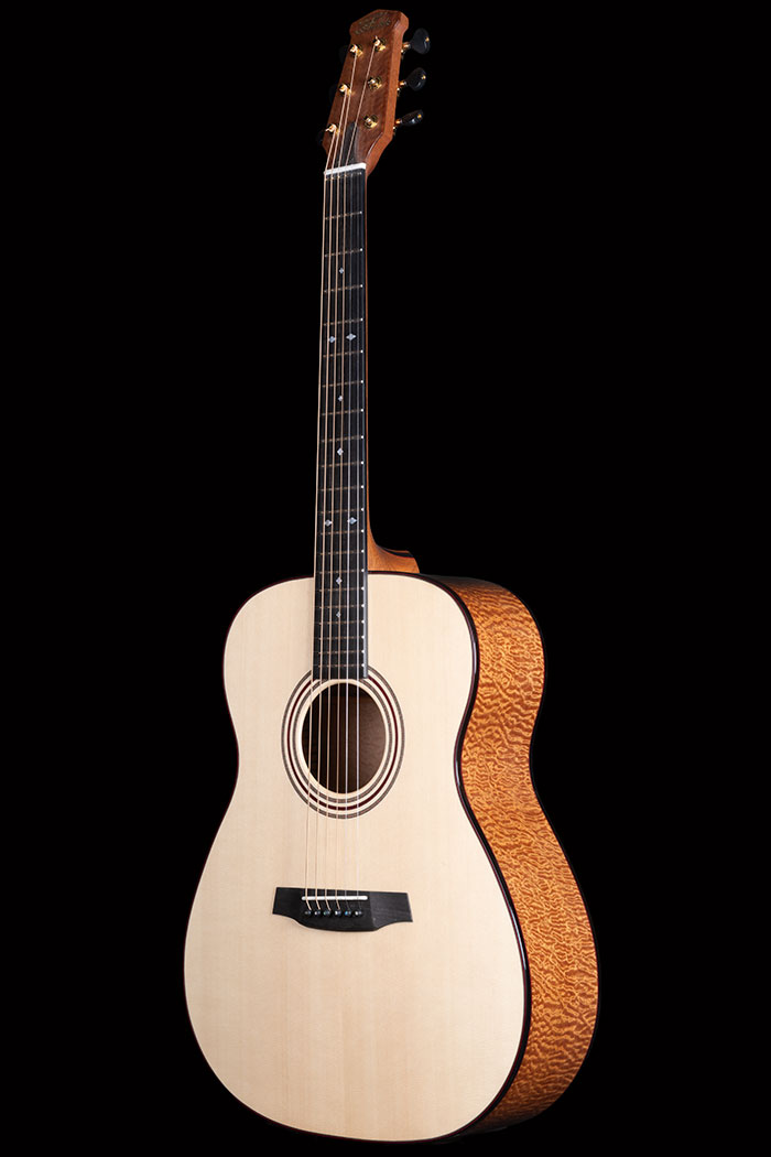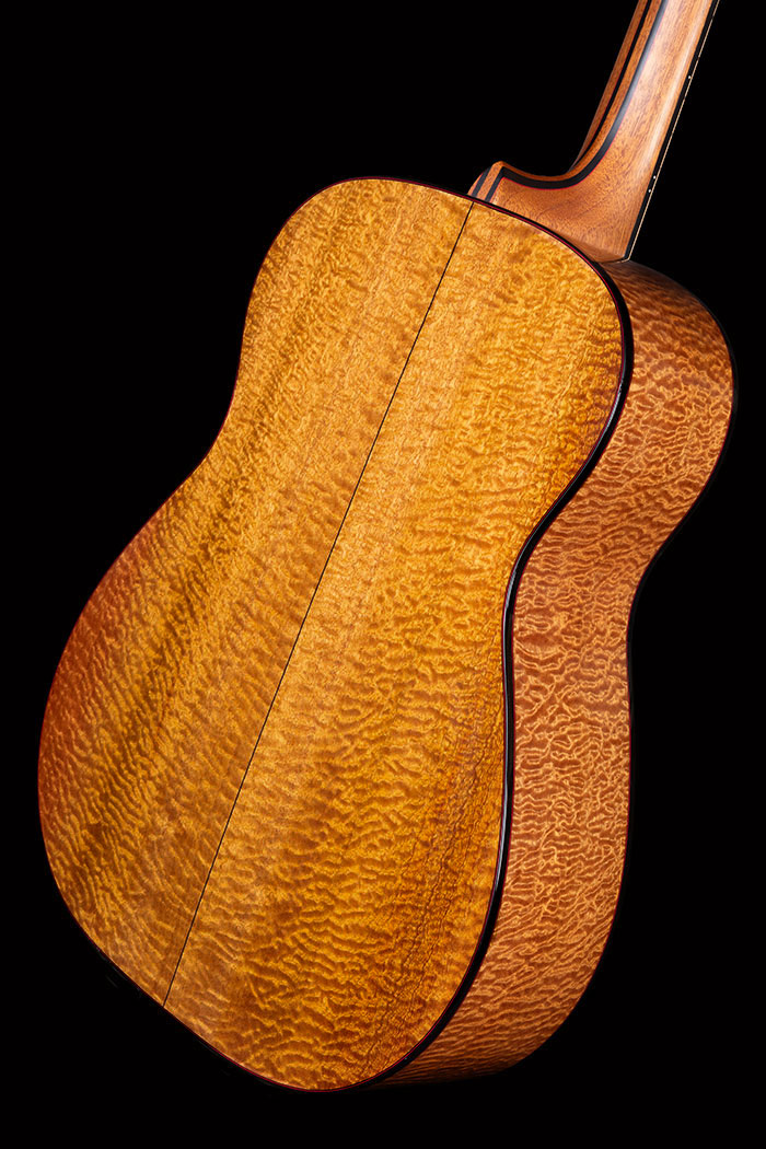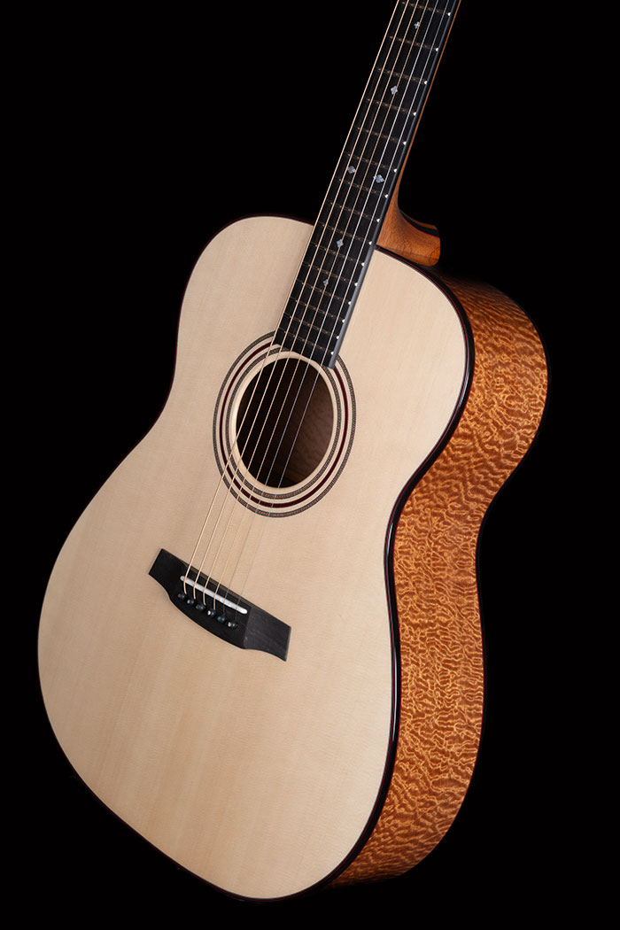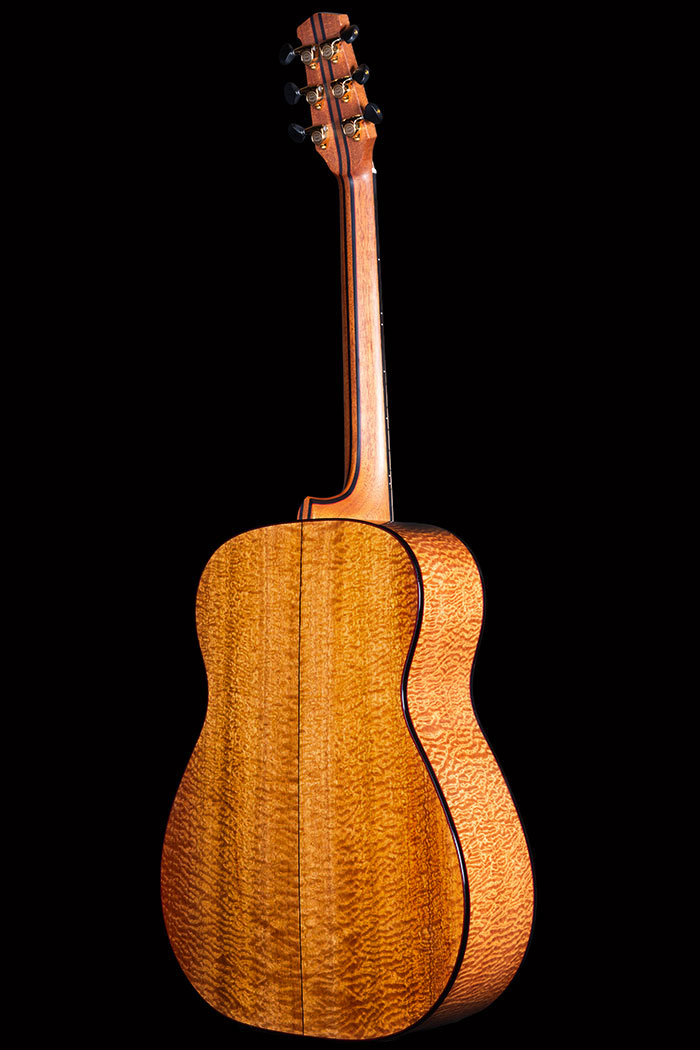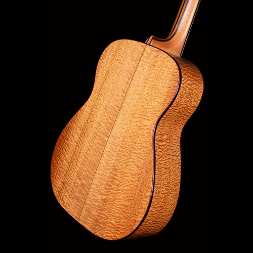 Deeply figured "Pomelle" Sapele and unbelievable Swiss Pine for the soundboard. The grain is so fine it is actually very difficult to see. Ebony bindings. Neck laminated with Mahogany and Ebony sections, all bordered by red lines. Pearl Diamond inlays. Gotoh 510 tuners.