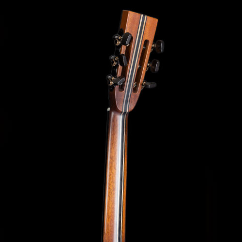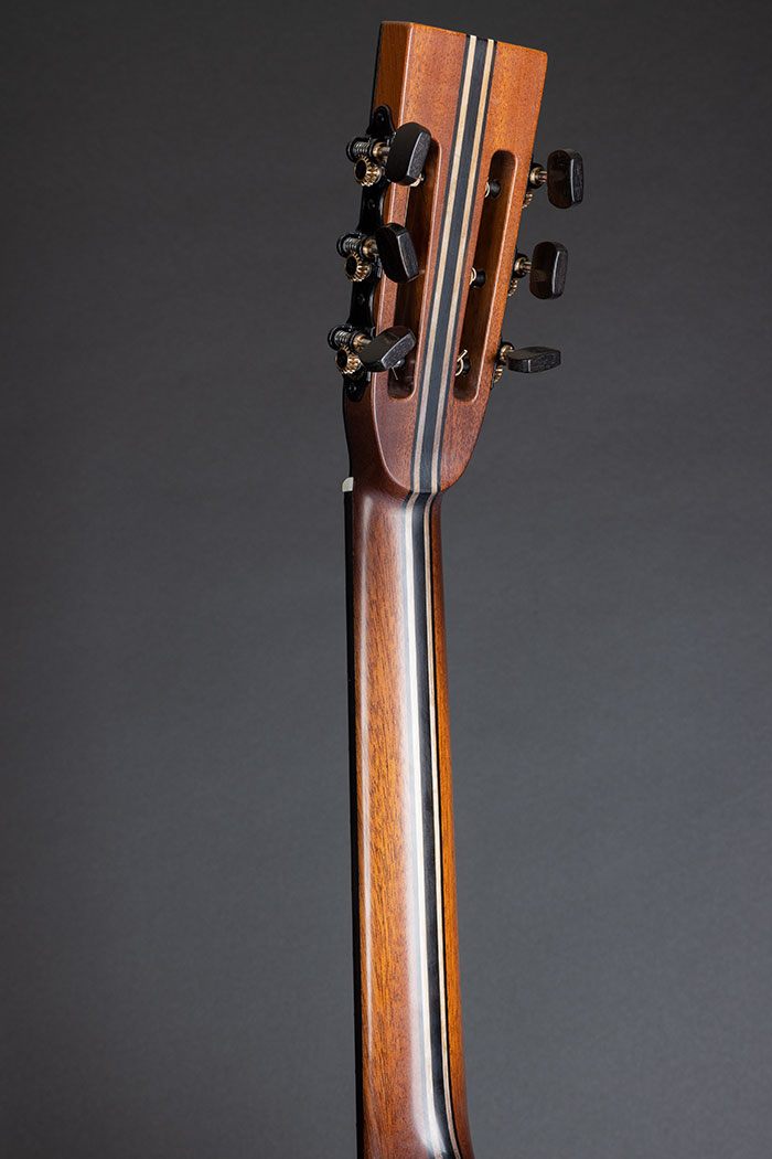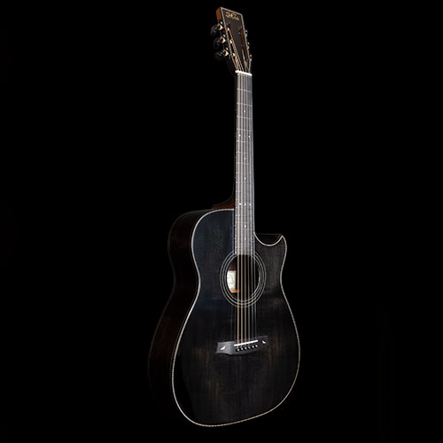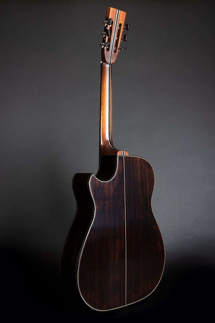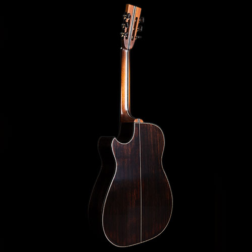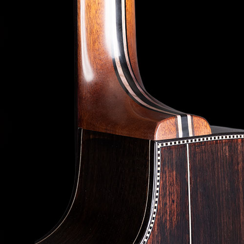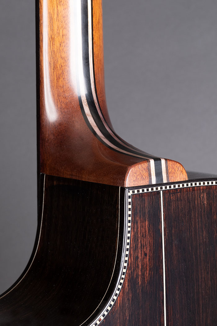 It's a long time since I "painted" a guitar, and it's not something I enjoy, inevitably it requires extra thickness of finish compared to what I am comfortable with, so the idea languished.  Then after a while, Martin Simpson told me that Richard had fallen in love with his "Orleans" guitar and we started to put various options together. I made some experiments in staining Spruce and Rosewood rather than painting the wood and getting extra “body” into a transparent finish. The back and sides are Indian Rosewood and the soundboard is European Spruce.  The neck is a laminate of Mahogany, Maple and Ebony, with just a little “mysterious” shading. The tuners are black Schallers, the strap pin is black, the neck is reinforced with carbon fibre, plus an adjustable truss rod, all working incredibly well. To complete the dark project, we fitted a Di Marzio Black Angel pickup which will match the impedance of Richard's Electric guitars on stage so he can use only one lead and not stress the sound engineer too much.