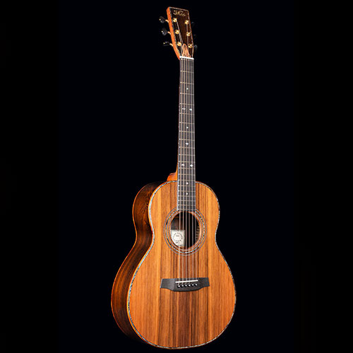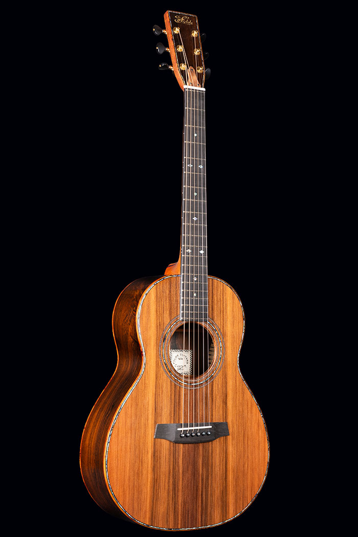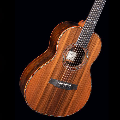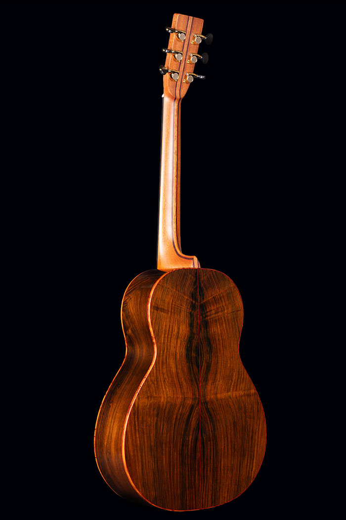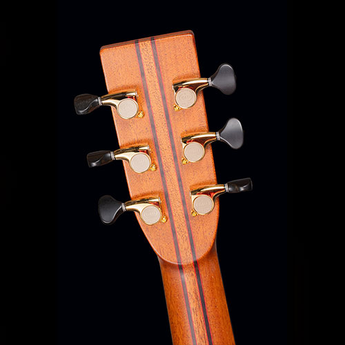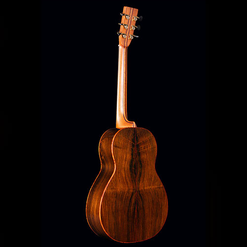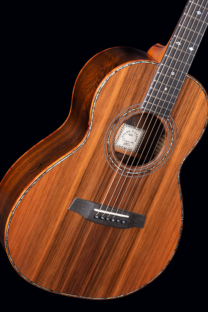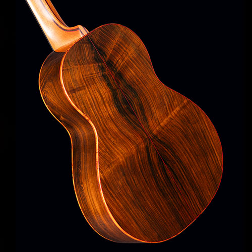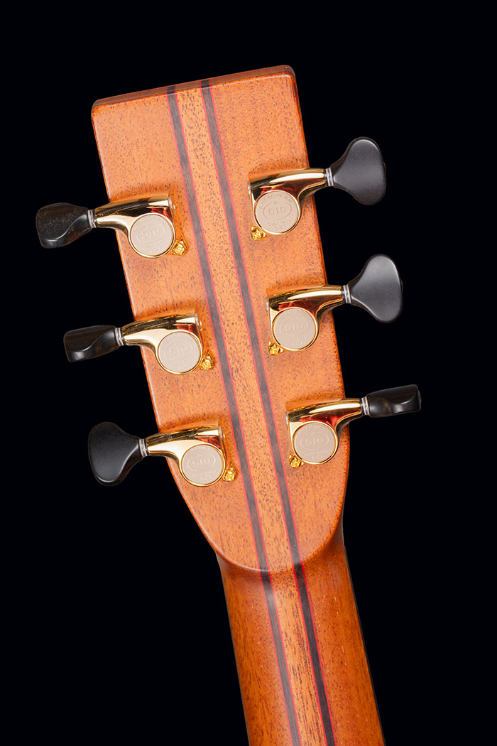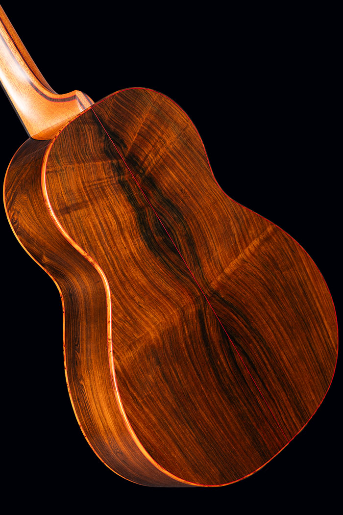 Figured Brazilian Rosewood back and sides. Sinker Redwood soundboard. Burr Yew bindings (we don’t know any other maker who uses this rare timber), with fine red borders. The neck is laminated from mahogany and Ebony again with red lines to emphasise the different timbers.