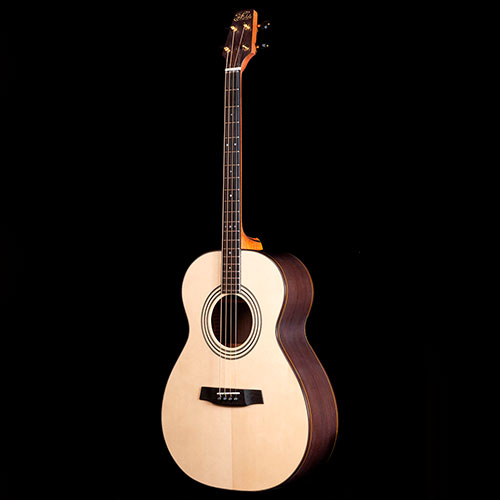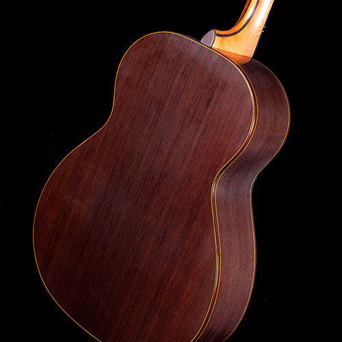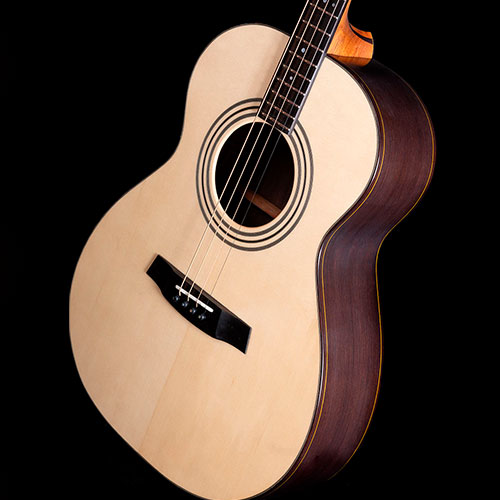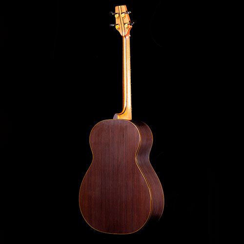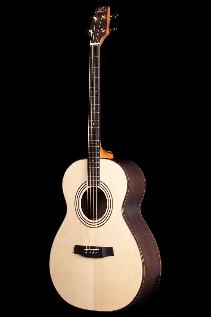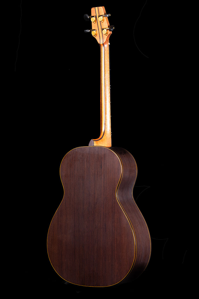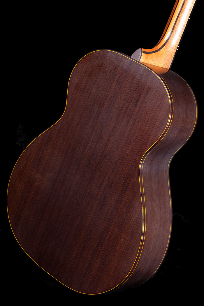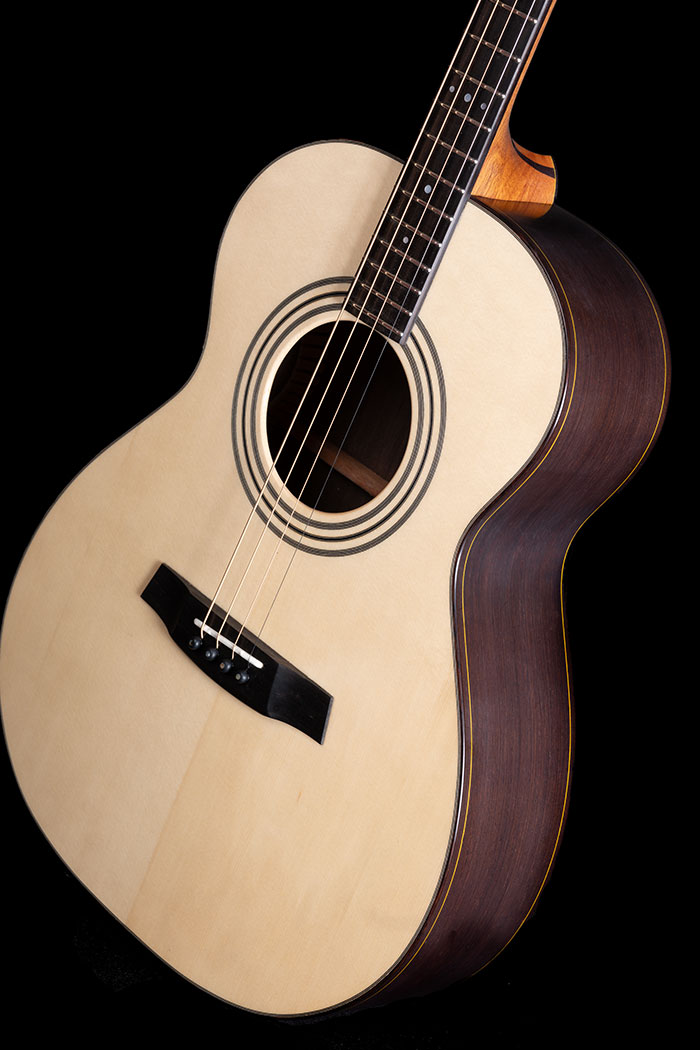 The top is Spruce, bindings Rosewood with gold lines, and the neck is laminated from Mahogany and Wenge. It’s a strong looking guitar, with the “headroom” and power we would expect from these timbers
