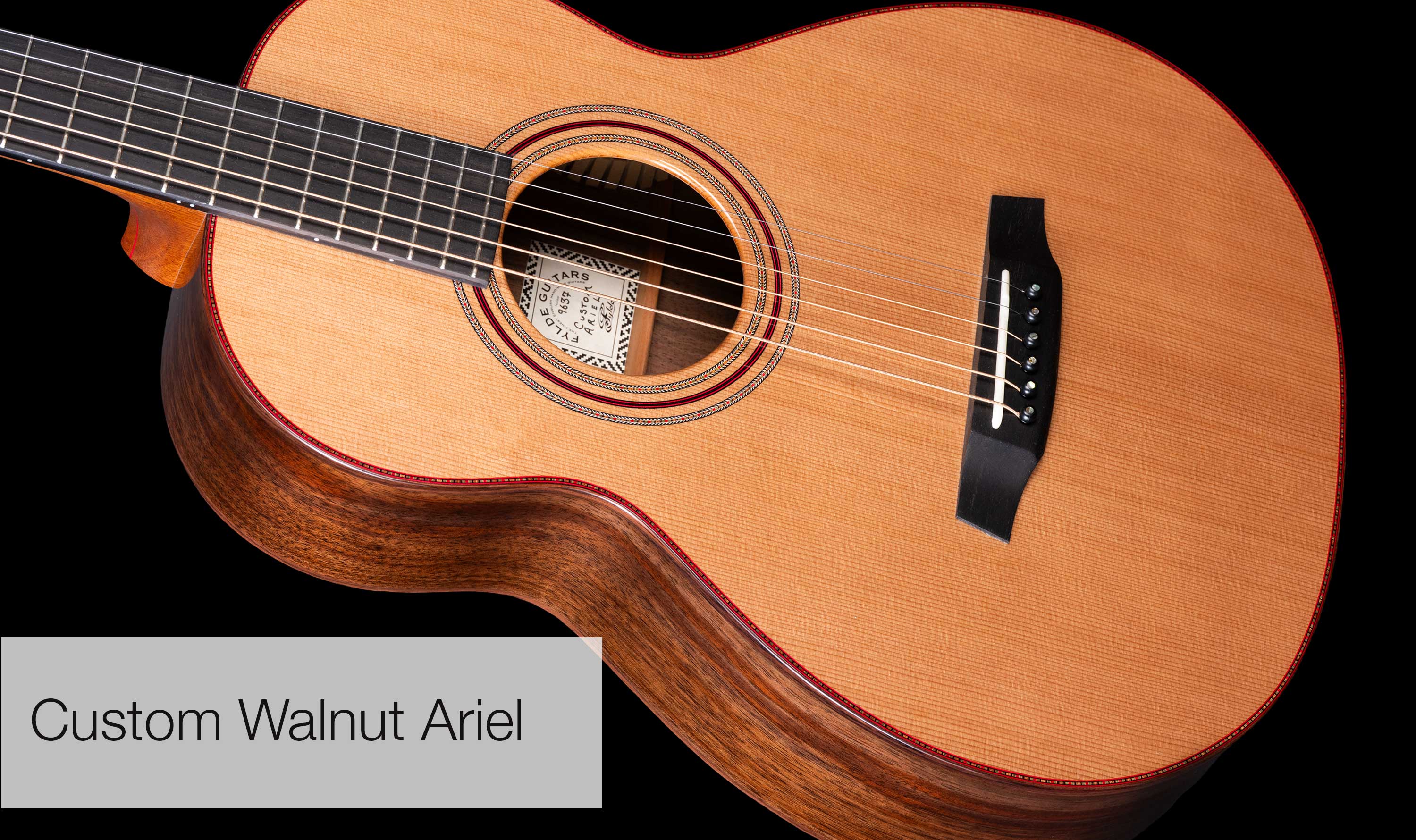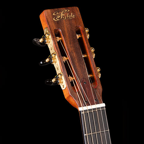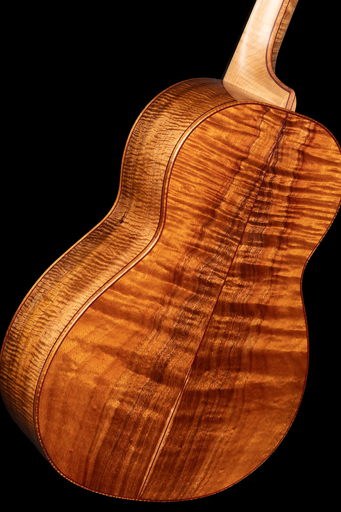 Deeply figured "Pomelle" Sapele and unbelievable Swiss Pine for the soundboard. The grain is so fine it is actually very difficult to see. Ebony bindings. Neck laminated with Mahogany and Ebony sections, all bordered by red lines. Pearl Diamond inlays. Gotoh 510 tuners.