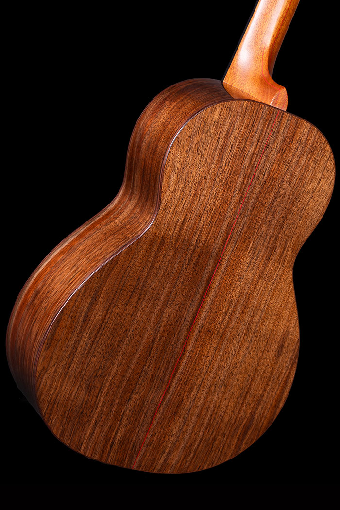 It's a very unusual combination of timbers for us. With a Spruce soundboard, I like to use the hardest and stiffest timbers for the back and sides, and that usually means the more exotic and expensive choices. When I bought this Pomelle some years ago, it wasn't the most expensive, but I've recently seen it for sale on American sites and it's becoming much more highly valued.