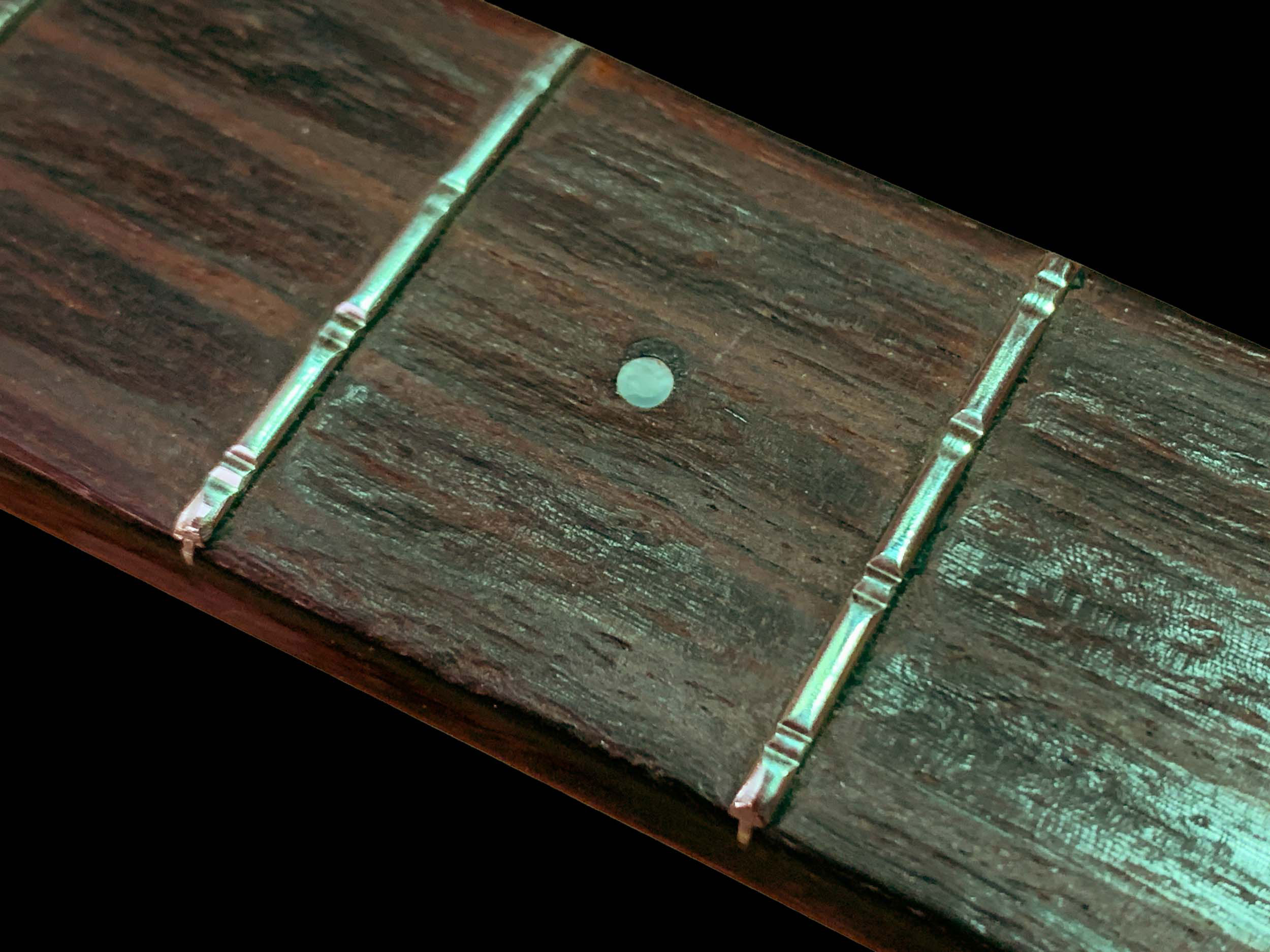 Antonio often tuned his bass string down to illegal notes. To accommodate that, we ground the frets under the bass string almost to nothing so that the strings don’t play out of tune when he presses them down. He also likes to tune the string quickly, so I fitted an oversize string post.