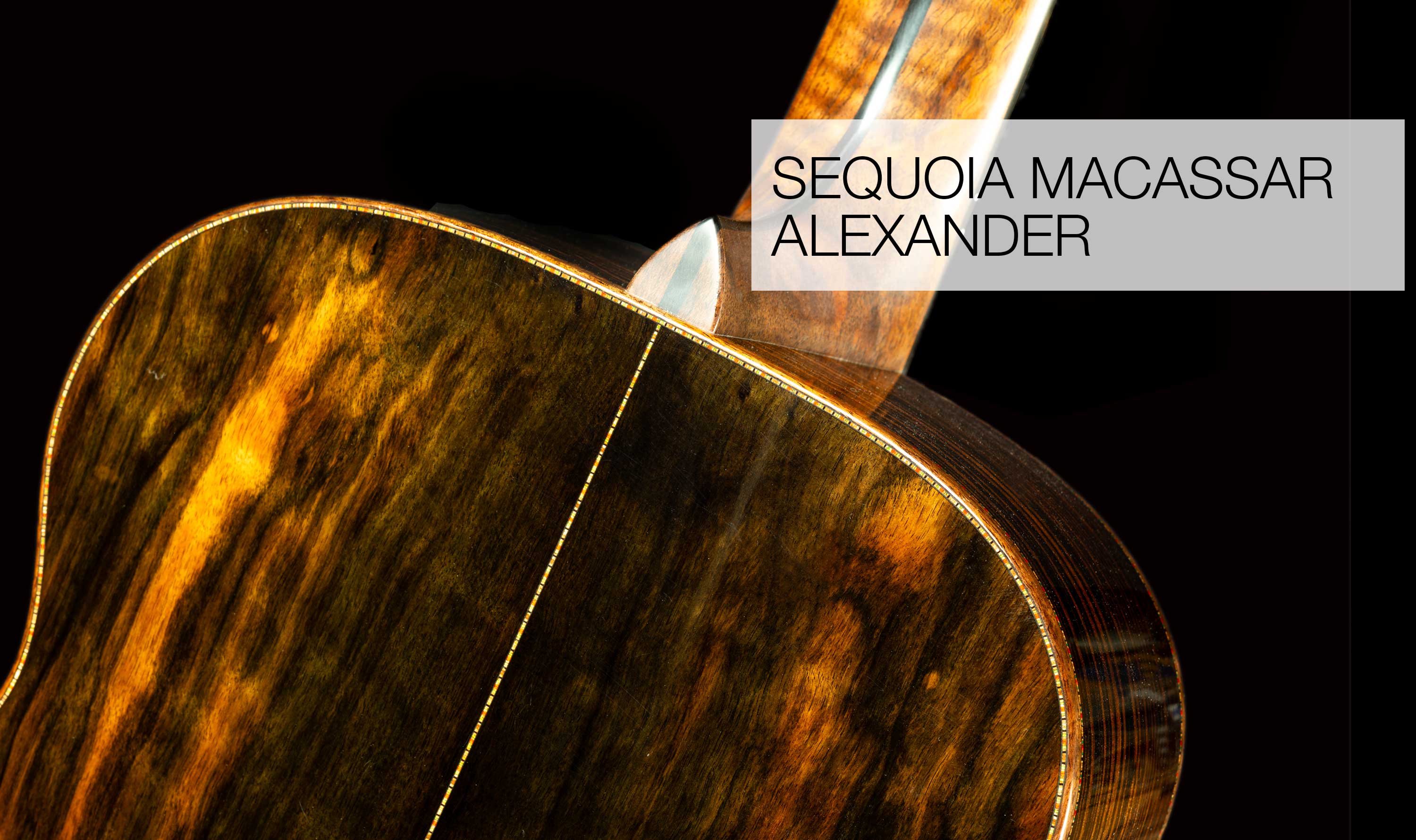 I love Seqouia. It is getting ever harder to get hold of, and as I've said before, that makes me rather annoyed, because just one tree would keep a lot of guitar makers busy for years. Moira and I are going to visit to the Redwoods very soon and invite one back to England. I love Macassar Ebony as well, and I'm happy to use the slightly gentler grain patterns rather than simple stripes. The neck is Walnut and Ebony, which matches the body and bindings rather well.