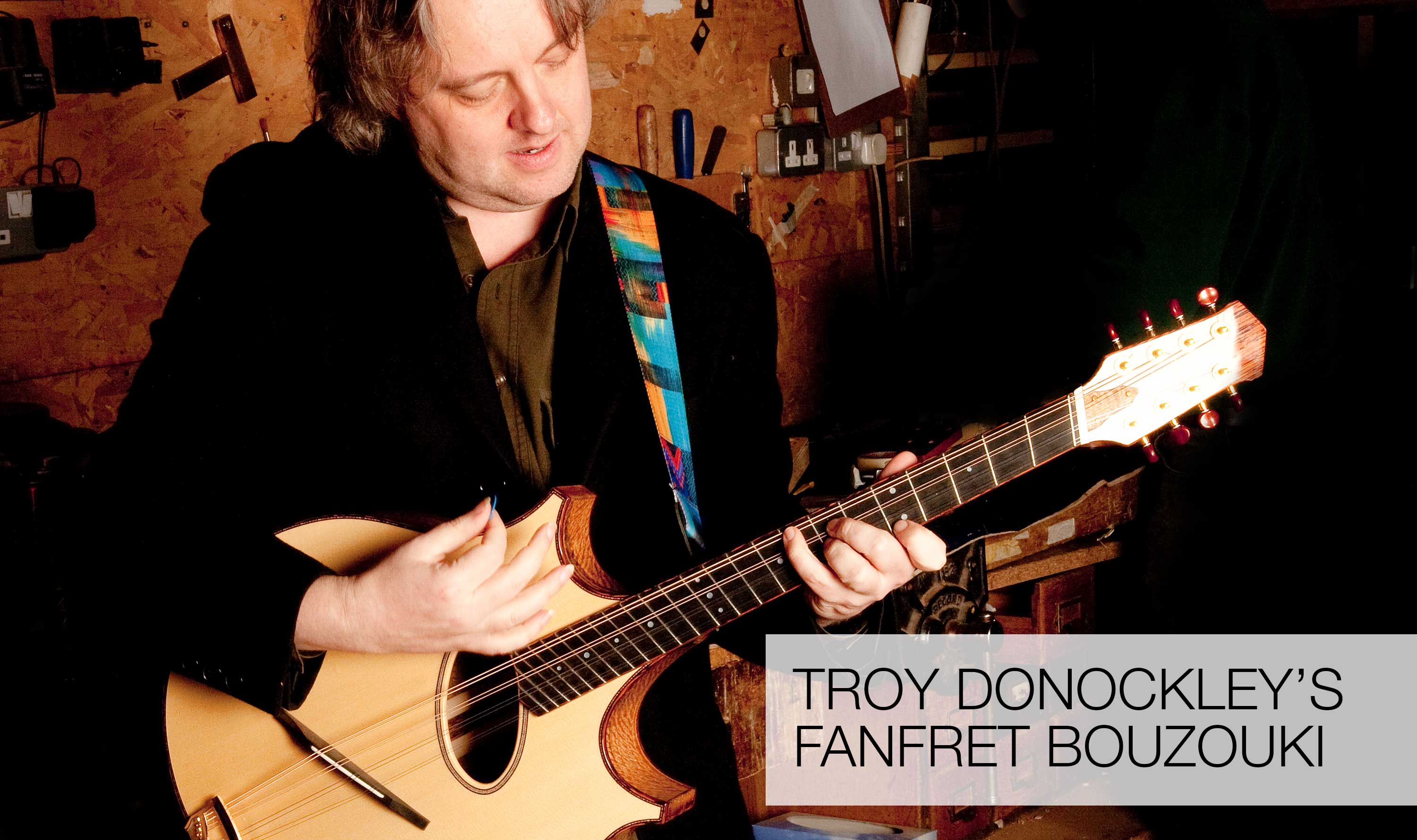 Troy Donockley wanted an “unusual” bouzouki, I think he wants to upstage Ade Edmonson. I suggested fan frets, and he said “fantastic” without realising there was a pun in that. I think this is the first ever fan fret bouzouki. (It was Ralph Novak who first applied this ancient European concept to the modern guitar).