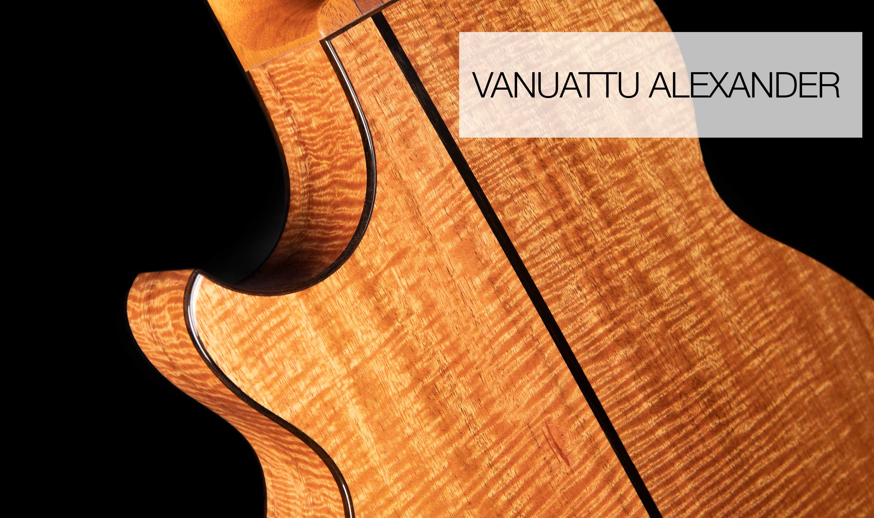 Gorgeous, very rare Vanuattu Blackwood back and sides (a relative of Koa). Cedar top. Long scale 12 fret neck to put the bridge in the best possible position and get maximum tonal range. Cutaway to keep the professional (showing off) fret access. Laminated neck with carbon fibre reinforcement and truss rod adjustment through the soundhole. Pearl diamond inlays. Ebony bindings. It's a development of ideas that I've been trying with people like Will McNicol and Martin Simpson. It sounds wonderful. Loud and very even.