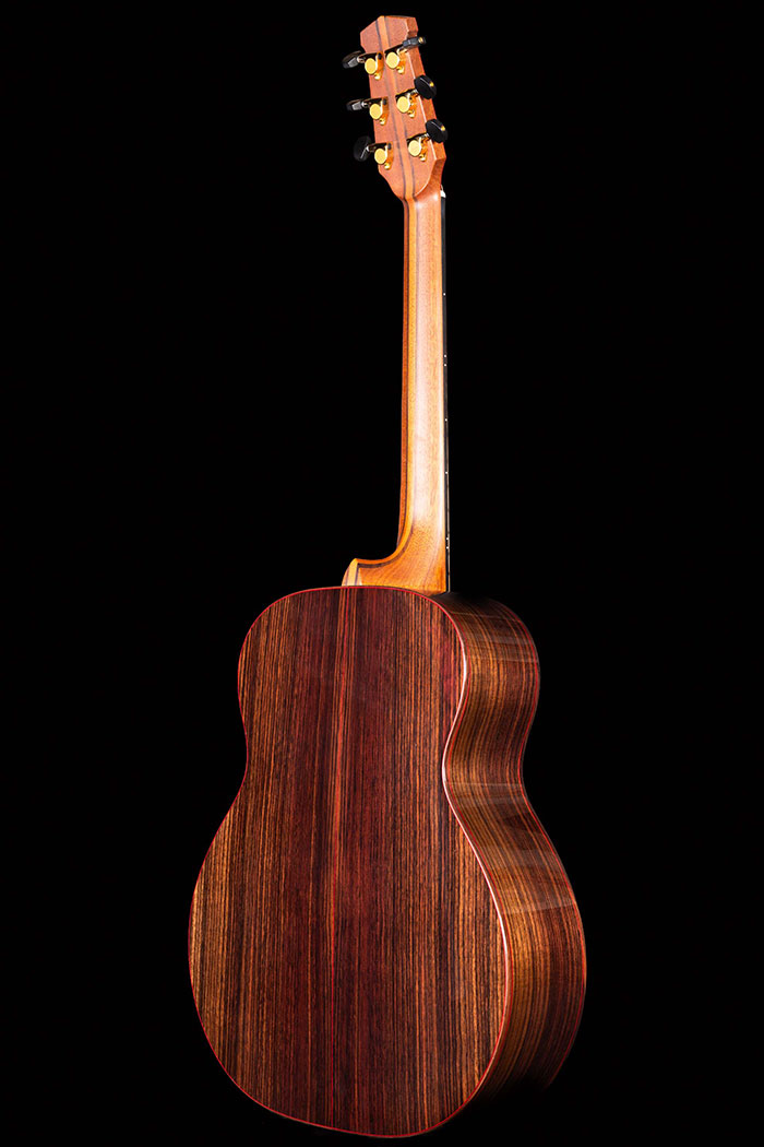 For this guitar I chose the best pieces of figured Claro Walnut to pair with the fine dark Sinker Redwood soundboard. The neck is made from Walnut and Mahogany, all possible only because we have such "extensive" timber stocks. Gotoh tuners, 45mm neck with Abalone Diamond inlays.