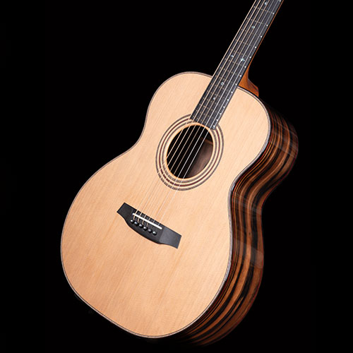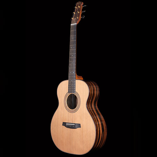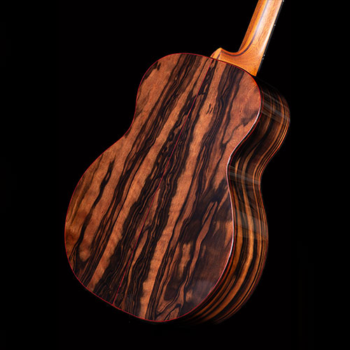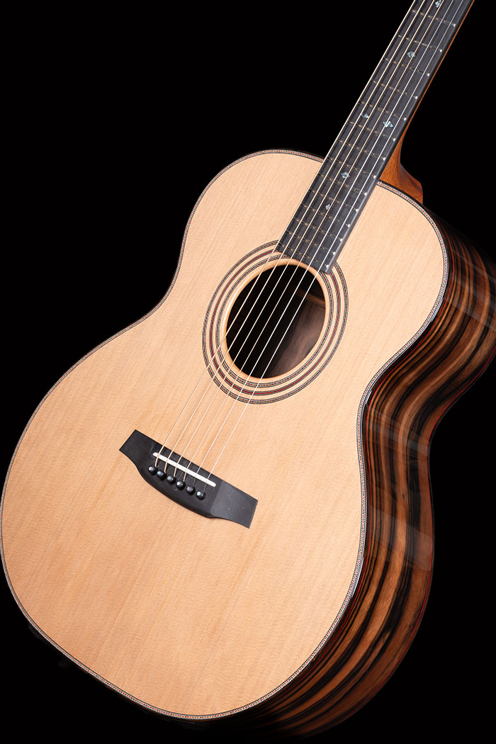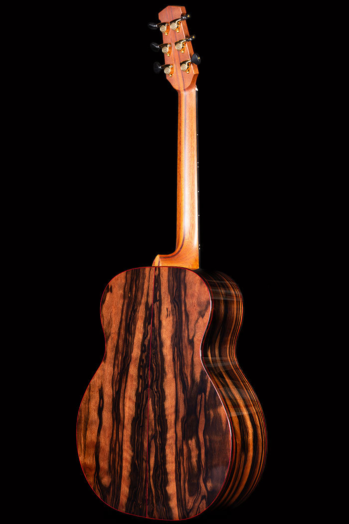 629mm scale length. Glorious colourful Macassar Ebony. Fine, selected Western Red Cedar soundboard. Ebony bindings with red borders.
