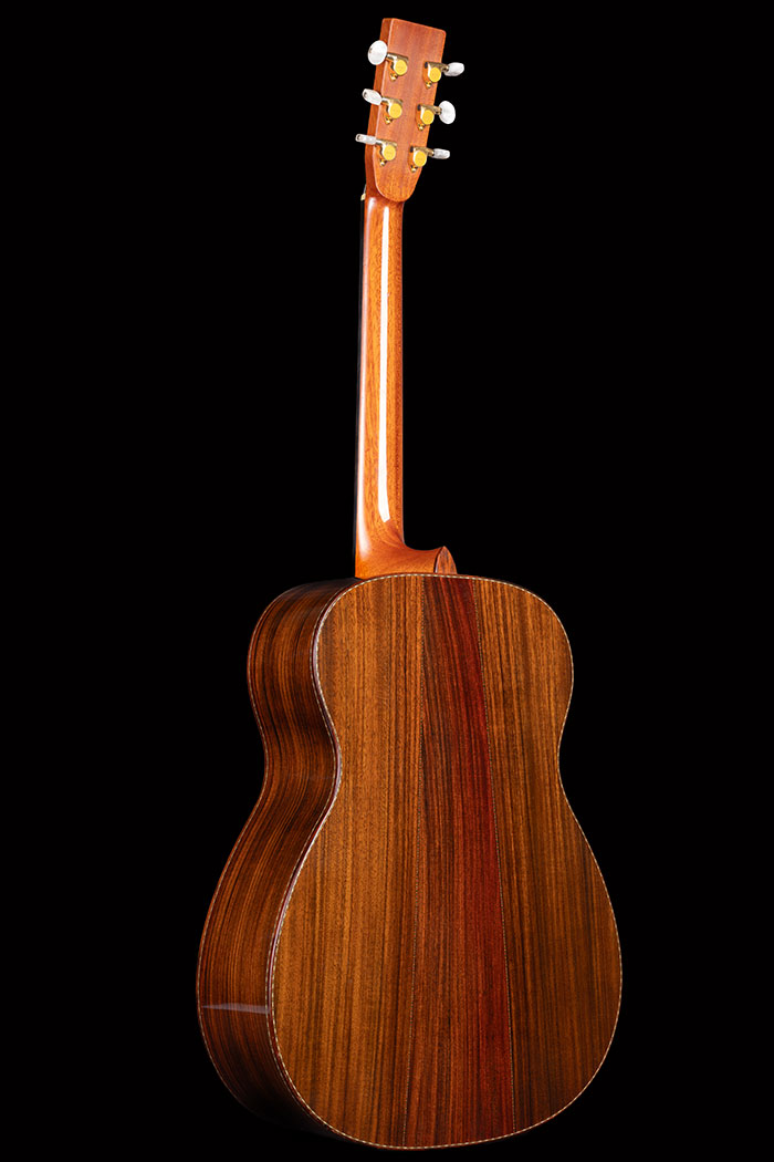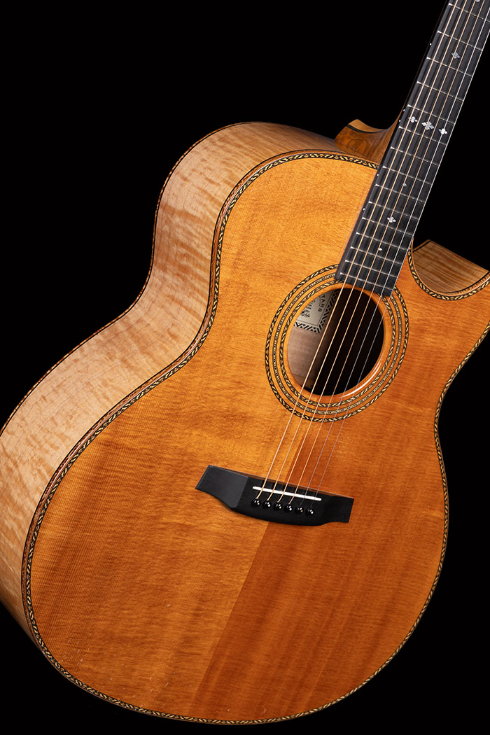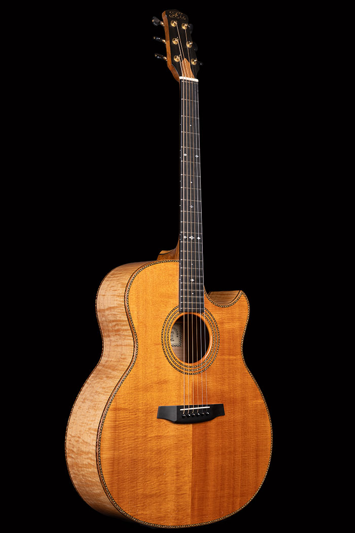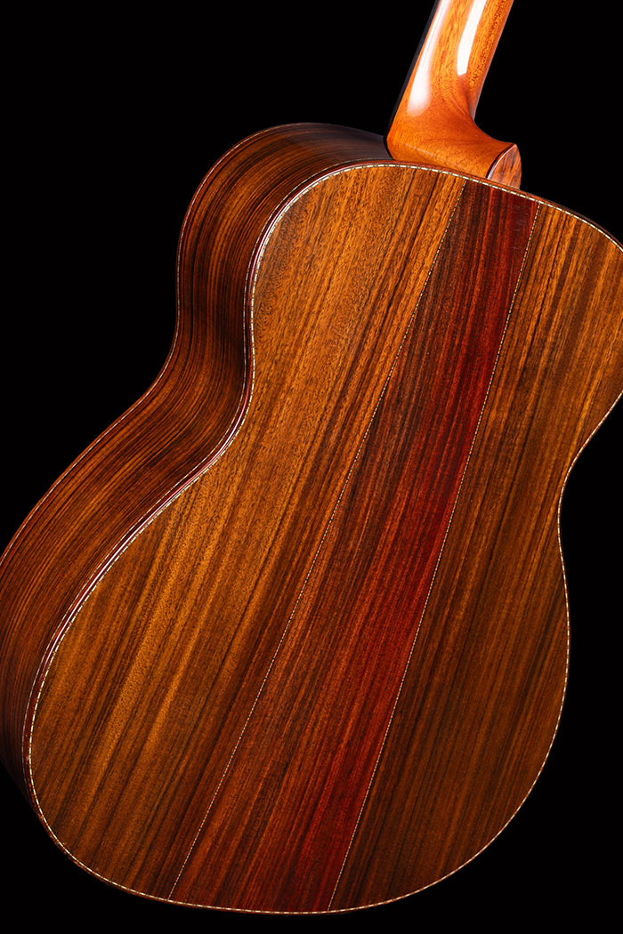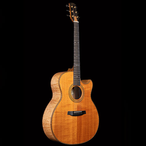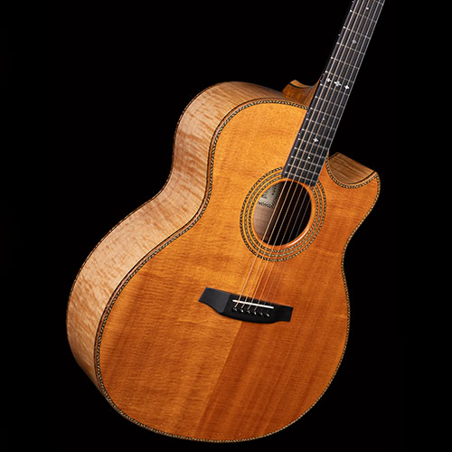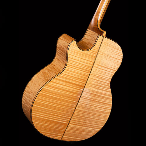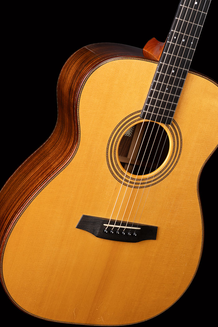 Falstaff size, very slightly shallower body. African Blackwood back and sides. Adirondack Spruce soundboard.