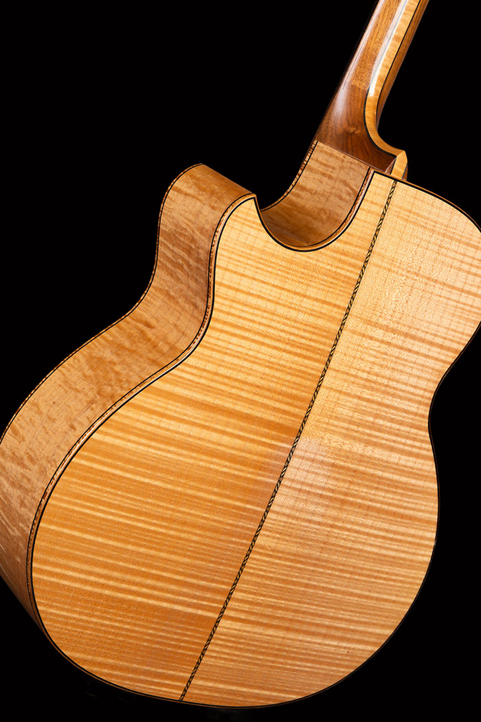The back and sides are "Curly" Maple, with a matching centre section running the full length of the neck, between two sections of English Walnut.