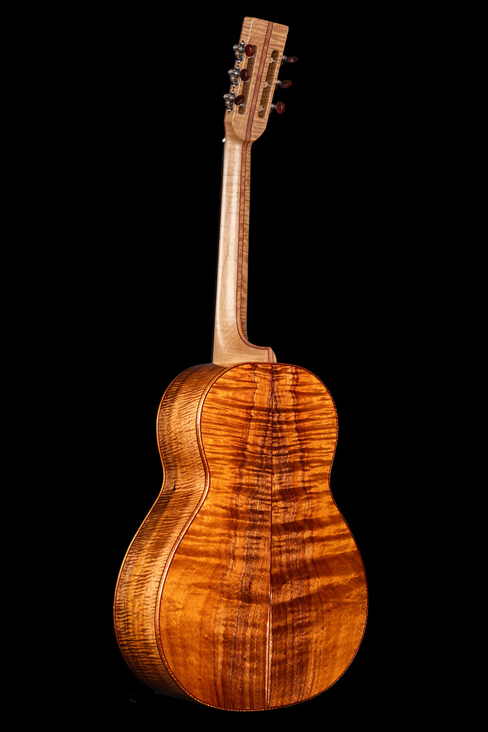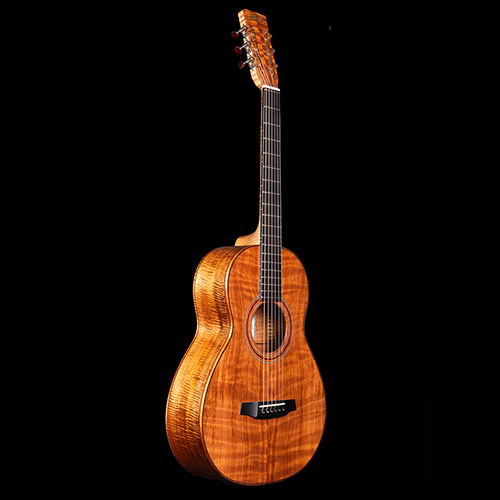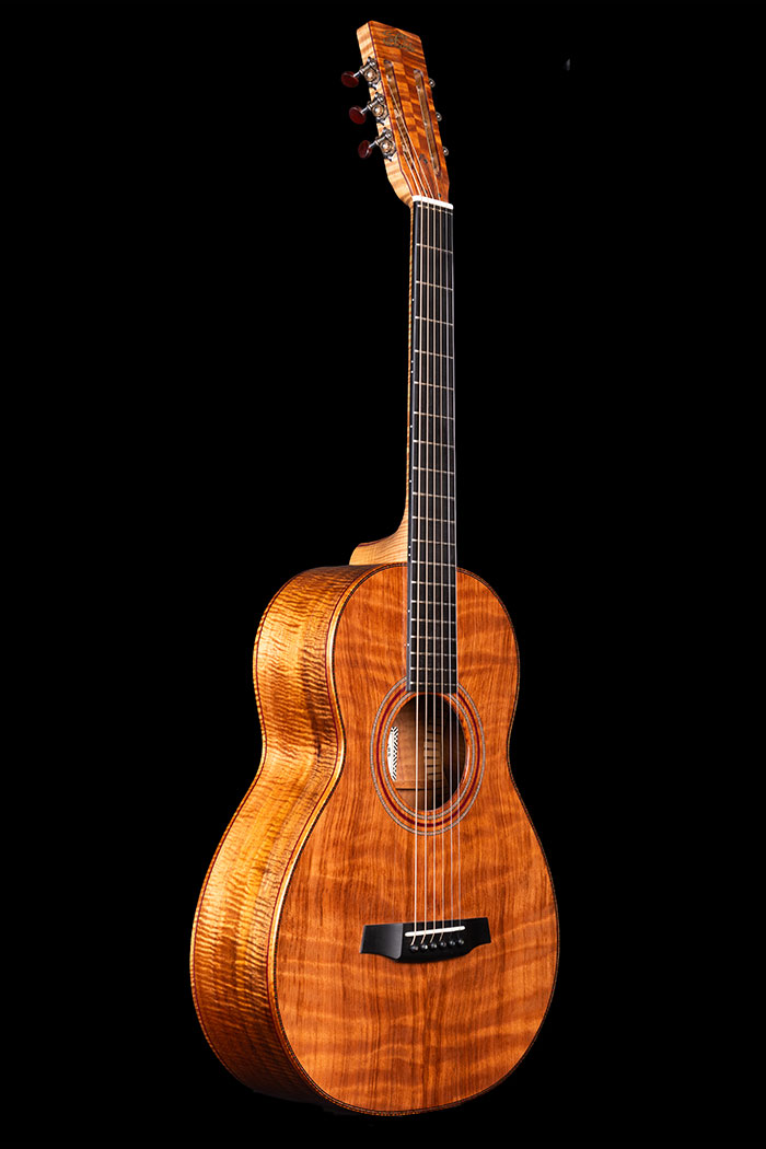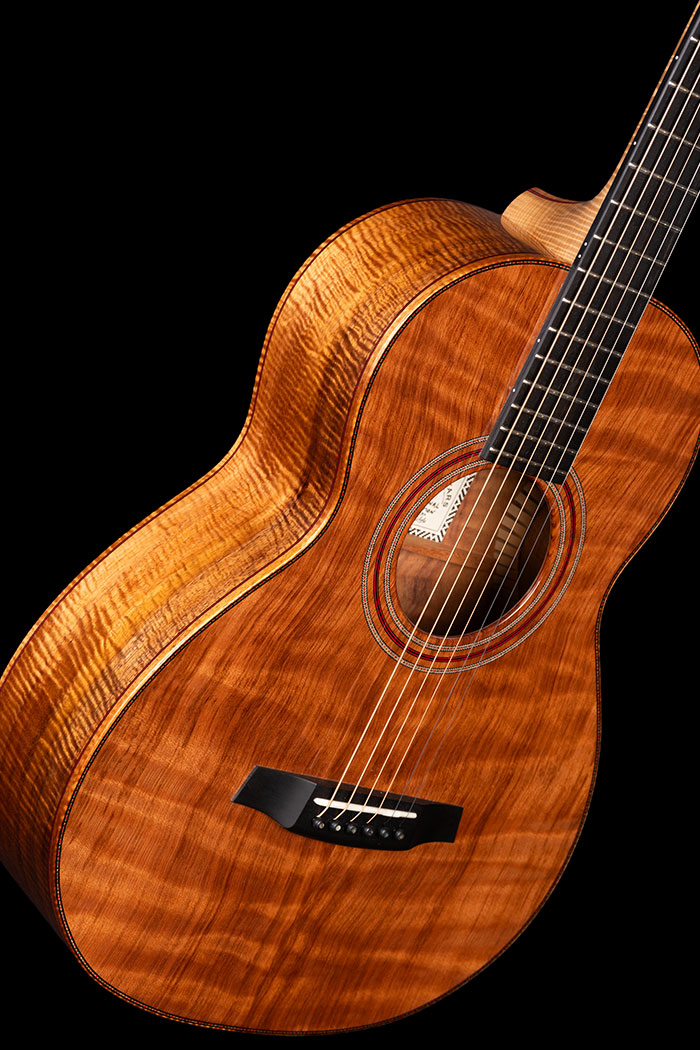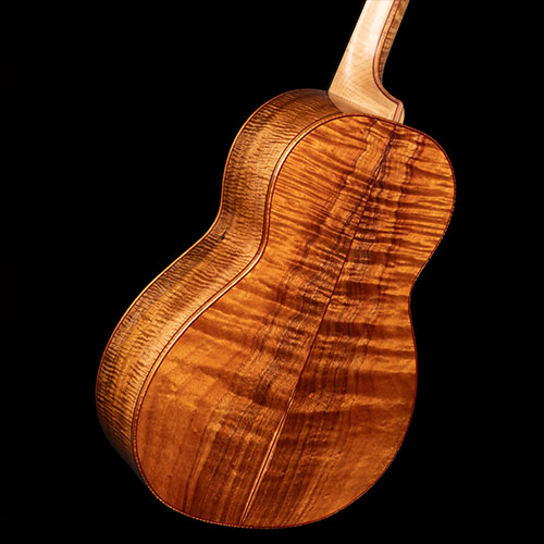 This rather special guitar was inspired by an article in the Sunday Times about the cost of the exotic woods used by some guitar makers. Figures of £10,000 and more were quoted for the rarest pieces of figured Koa being imported into the UK, then sold to makers in other parts of the world.