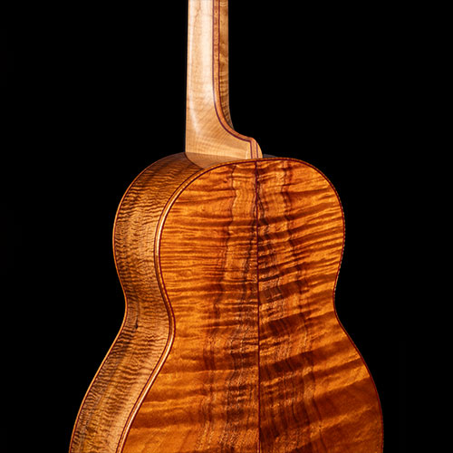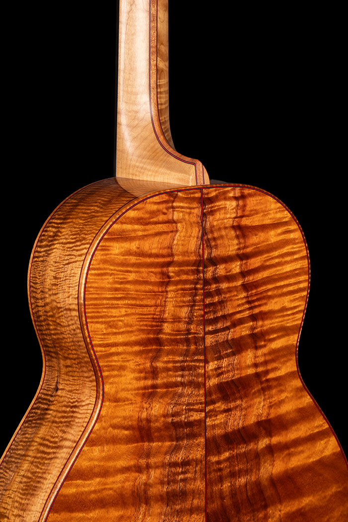 The back and sides are of course Curly Koa from Hawaii, via one of those special contacts I mentioned, and the bindings are made from the same pieces of wood, Paul has just reversed the grain and added gentle borders to make the colours "pop". The soundboard is Salvaged Redwood that Moira and I collected from a long-established supplier in Oregon, (a beautiful spot right on the coast, overlooking the Pacific Ocean) and the neck is Torrified Rock Maple from Seth Baccus guitars in England.