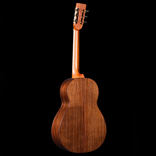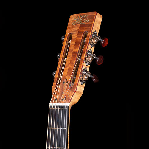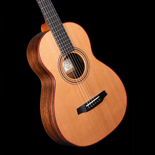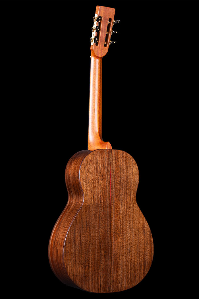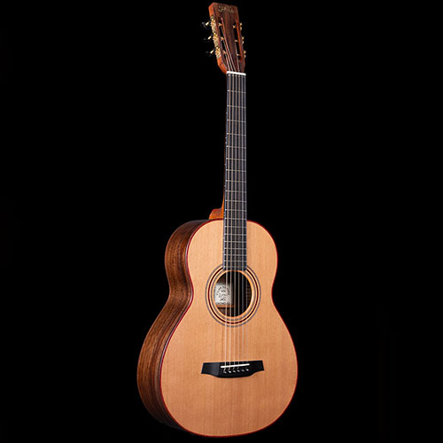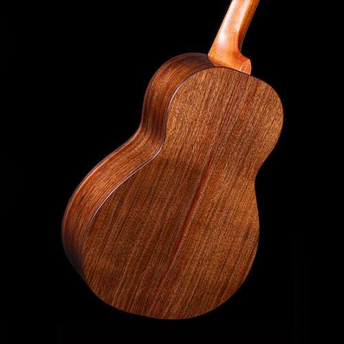 Dark Claro Walnut back and sides with subtle red lines bordering the Rosewood bindings. The honey-coloured Cedar soundboard is decorated with mosaic purflings and more gentle red lines. The neck is laminated from three sections of Mahogany, again with delicate red lines.